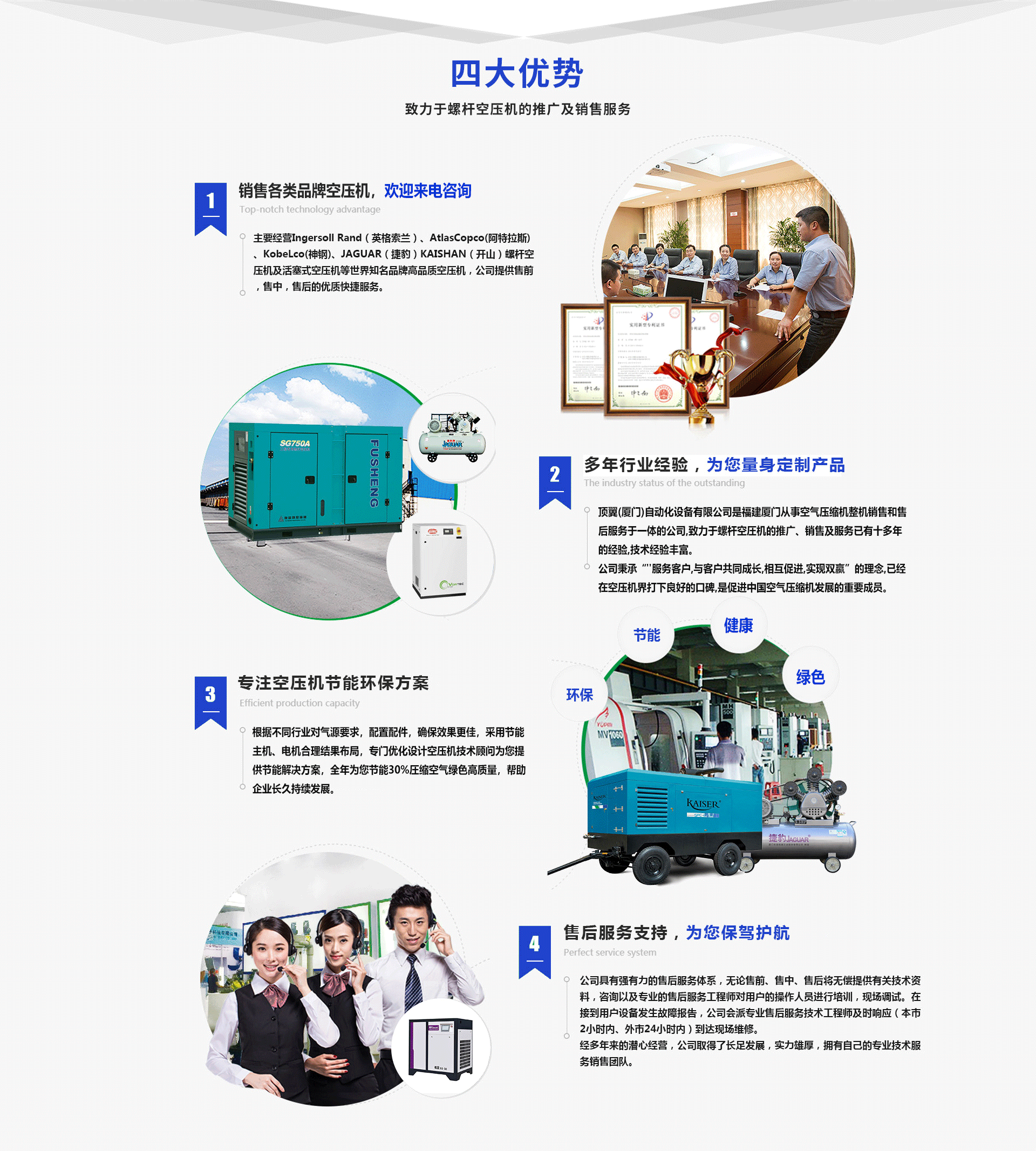 頂翼(廈門(mén))自動(dòng)化設(shè)備有限公司是福建廈門(mén)一家從事空氣壓縮機(jī)整機(jī)銷(xiāo)售和售后服務(wù)于一體的公司,致力于螺桿空壓機(jī)的推廣、銷(xiāo)售及服務(wù)已有十多年的經(jīng)驗(yàn),技術(shù)力量強(qiáng)。 公司秉承“服務(wù)客戶(hù),與客戶(hù)共同成長(zhǎng),相互促進(jìn),實(shí)現(xiàn)雙贏(yíng)”的理念,已經(jīng)在空壓機(jī)界打下良好的口碑,是促進(jìn)中國(guó)空氣壓縮機(jī)發(fā)展的重要成員。公司具有強(qiáng)有力的售后服務(wù)體系,無(wú)論售前、售中、售后將無(wú)償提供有關(guān)技術(shù)資料,咨詢(xún)以及售后服務(wù)工程師對(duì)用戶(hù)的操作人員進(jìn)行培訓(xùn),現(xiàn)場(chǎng)調(diào)試,在接到用戶(hù)設(shè)備發(fā)生故障報(bào)告,公司專(zhuān)門(mén)會(huì)派售后服務(wù)技術(shù)工程師及時(shí)響應(yīng)(本市2小時(shí)內(nèi)、外市24小時(shí)內(nèi))到達(dá)現(xiàn)場(chǎng)維修。 經(jīng)多年來(lái)的潛心經(jīng)營(yíng),公司取得了長(zhǎng)足發(fā)展,實(shí)力強(qiáng),擁有自己的技術(shù)服務(wù)銷(xiāo)售團(tuán)隊(duì)。主要經(jīng)營(yíng)IngersollRand(英格索蘭)、AtlasCopco(阿特拉斯)、KobeLco(神鋼)、JAGUAR、(捷豹)KAISHAN(開(kāi)山)螺桿空壓機(jī)及活塞式空壓機(jī)等品牌空壓機(jī),公司提供售前,售中,售后的快捷服務(wù)。